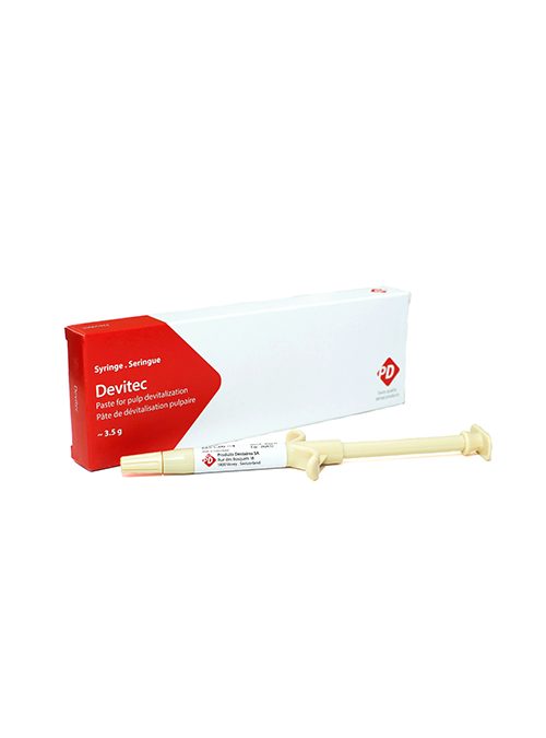 Devitec should be used when a medicated preparation for pulp devitalization is advisable and when an arsenic-free preparation is preferred. The active ingredient is Polyoxymethylene, a coagulant which acts on albumin and confers the required fibrous consistency to the pulp to facilitate its subsequent extirpation.